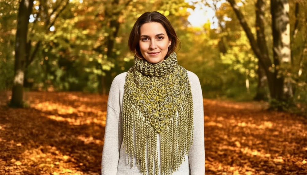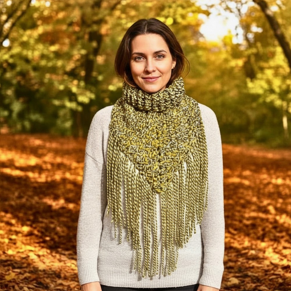 Your snug, modern scarf neck warmer with a built-in ribbed collar is ready to keep you cozy all season! The unique closed granny triangle provides extra warmth, while the flexible collar and optional fringe add style and function.