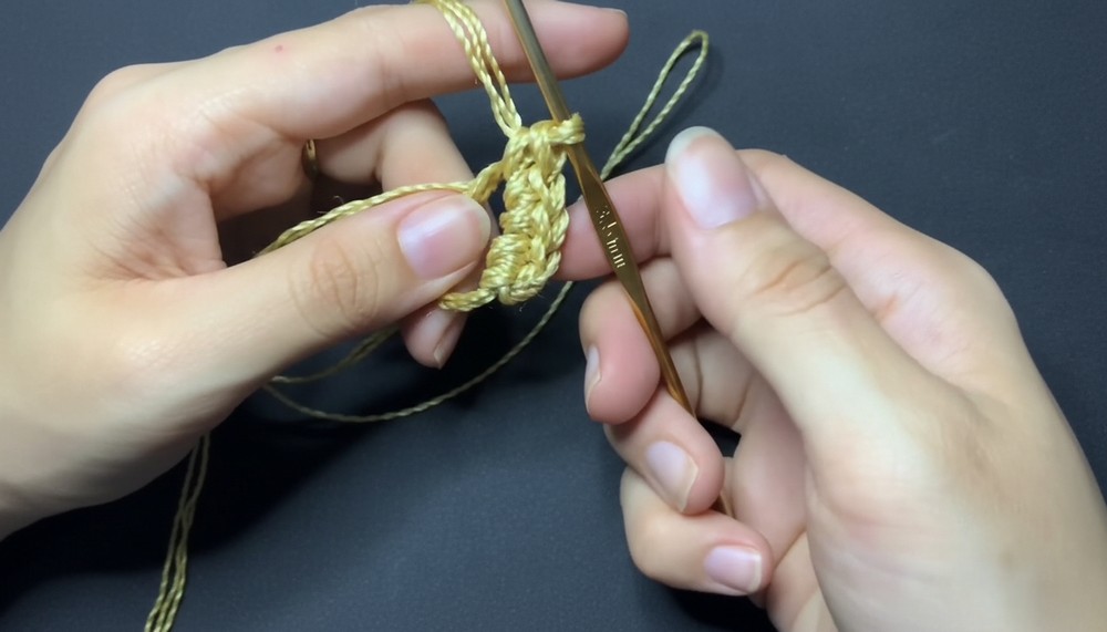 Technique: The tutor uses the “Triple Strand” method. This allows you to work with three strands from a single spool by folding the yarn into an “S” shape and pulling it through the loops as you crochet [01:03].