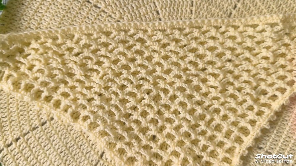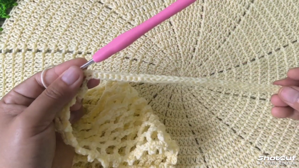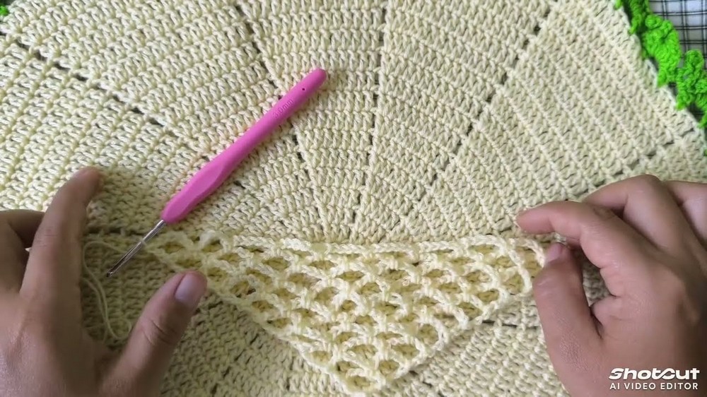 - Across the head (straight) edge, work 3 single crochet in every space/hole.