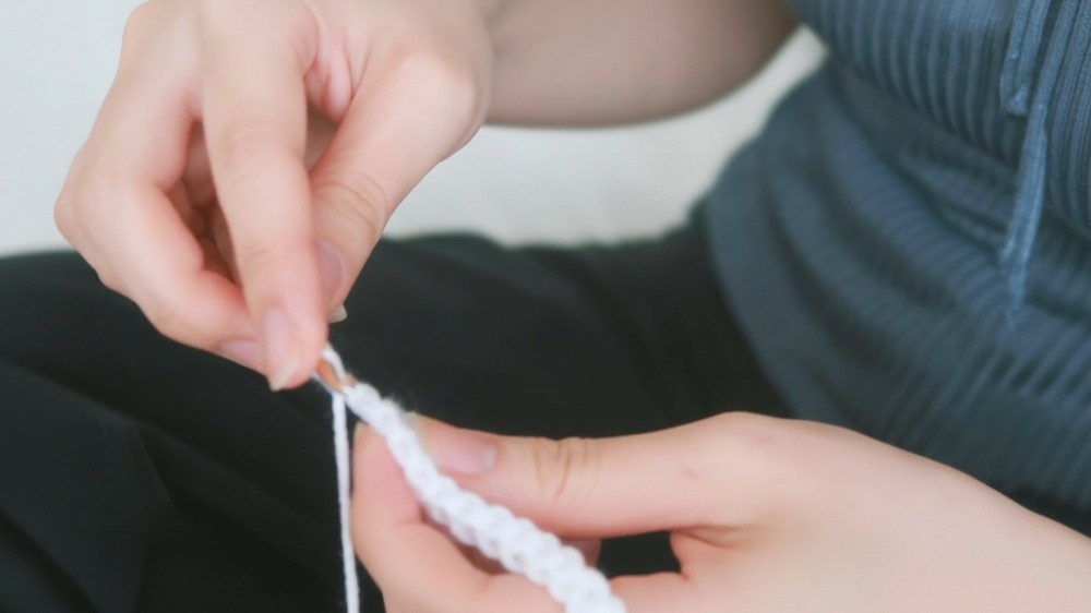 - Turn, double crochet in third chain from hook and across (8 dc per row).