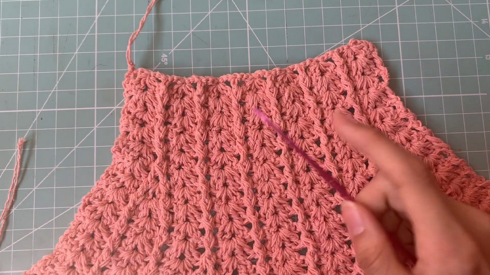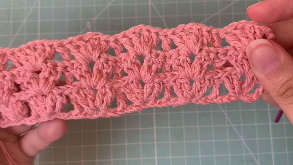 Row 6: In the first and last relief stitches of the row, work (1 relief stitch, ch 1, 1 relief stitch) in the same place. This creates a “V” to start a new fan [12:43].