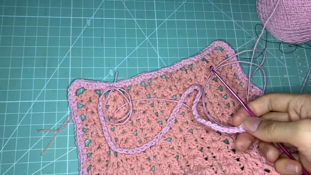 Neck Ties: Attach yarn to the top corners, chain the desired length, and use slip stitches to work across the top edge to the other side before making the second tie [41:08].